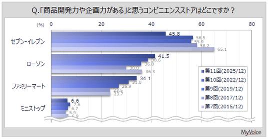 【コンビニのイメージに関する調査】商品開発力や企画力があるイメージは「セブン‐イレブン」が首位を維持するものの、続く「ローソン」との差は縮小。独自性においても、増加傾向の「ローソン」と僅差に
