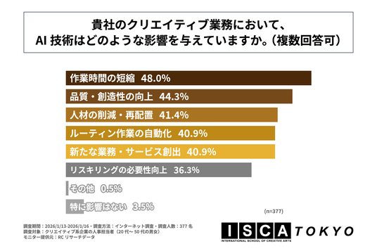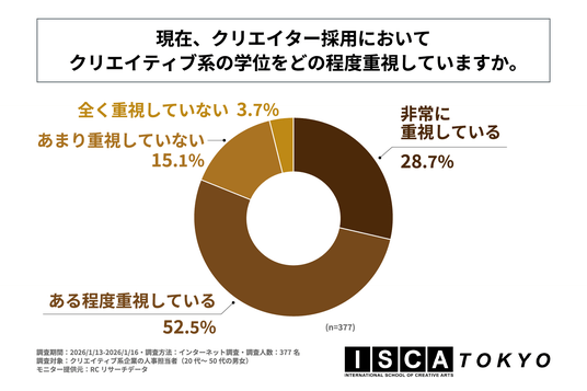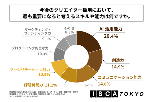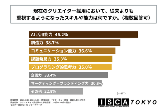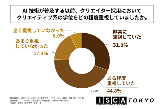 株式会社芙蓉エデュケーションズ(本社:東京都文京区、代表取締役:安田 聡子)が運営する「ISCA TOKYO」は、クリエイティブ系企業の人事担当者(20代~50代の男女)を対象に「AI時代のクリエイティブ業界で求められる学位や能力に関する調査」を実施しました。この調査から、クリエイティブ系企業の人事担当者が考えるAI技術が業務に与える影響や、AI時代のクリエイター採用で重視する学位やスキル・能力などが明らかになりました。