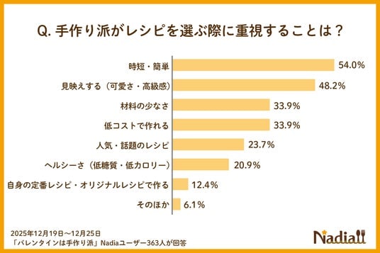手作り派がレシピを選ぶ際に重視するポイントは、「時短・簡単(54%)」と「見映え(48.2%)」が上位に。コストの低さ以上に「見た目の華やかさ」が優先される結果となりました。