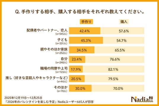 注目すべきは、贈る相手によって「手作り」と「購入」の比率が異なる点です。今回のアンケートによると、その相手に贈る人のうち、「手作り」をする割合が高いのは「子ども(45.3%)」や「配偶者やパートナー、恋人(42.4%)」でした。大切な家族やパートナーなど身近な相手には、手作りならではの「ちょっとした特別感」を届けたいという気持ちがうかがえます。