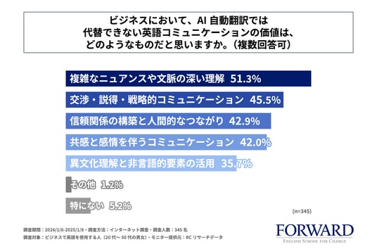 ビジネスで英語を使用する人の半数以上が、AI自動翻訳では代替できない英語コミュニケーションの価値は、「複雑なニュアンスや文脈の深い理解」にあると考えている