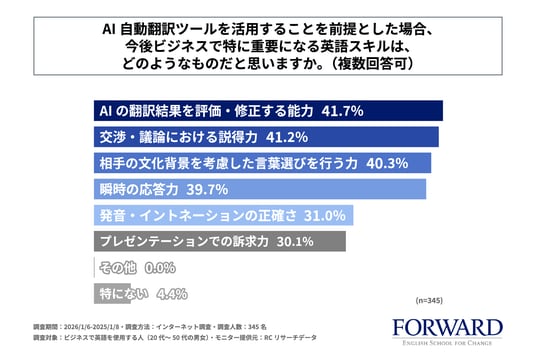 調査の最後、「AI自動翻訳ツールを活用することを前提とした場合、今後ビジネスで特に重要になる英語スキルは、どのようなものだと思うか」を尋ねる設問への回答では、1位が「AIの翻訳結果を評価・修正する能力」で41.7%、2位が「交渉・議論における説得力」で41.2%、3位が「相手の文化背景を考慮した言葉選びを行う力」で40.3%という結果になりました。また、4位以降も回答率30%を超える回答が並ぶ形となり、この結果から、AI自動翻訳ツールを活用することを前提とした場合、今後ビジネスで特に重要になると考える英語スキルは多岐にわたることが明らかになりました。