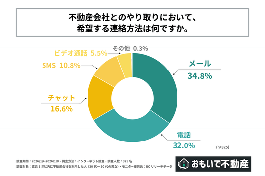 次に、直近1年以内に不動産会社を利用した人を対象に「不動産会社とのやり取りにおいて、希望する連絡方法は何か」を尋ねる設問への回答では、1位が「メール」で34.8%、2位が「電話」で32.0%、3位が「チャット」で16.6%という結果になりました。この結果から、直近1年以内に不動産会社を利用した人が不動産会社とのやり取りにおいて希望する主な連絡方法は「メール」や「電話」であることが判明しました。