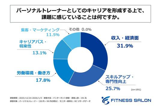 パーソナルトレーナーとしてのキャリアを形成する上で、主に課題に感じていることは「収入・経済面」や「スキルアップ・専門性向上」