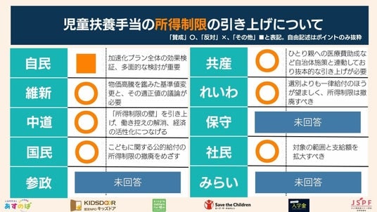 - 回答状況:自由民主党、日本維新の会、中道改革連合、国民民主党、れいわ新選組、日本共産党、社会民主党より回答(1月26日現在)※未回答の政党の回答については、回答があれば、順次公表する予定です。