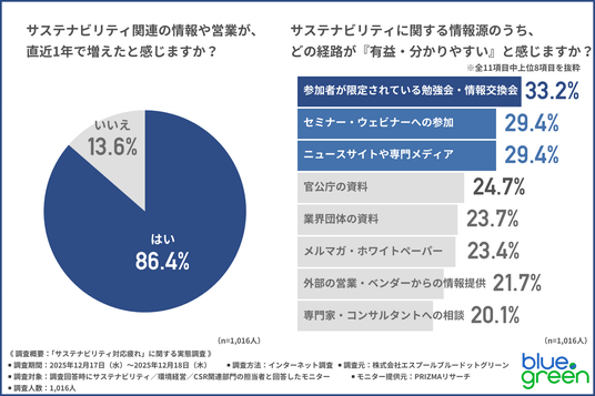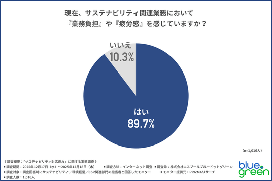 株式会社エスプールブルードットグリーン(本社:東京都千代田区、取締役社長:八林 公平、以下「エスプールブルードットグリーン」)は、サステナビリティ/環境経営/CSR関連部門の担当者を対象に、「サステナビリティ対応疲れ」に関する実態調査を行いました。