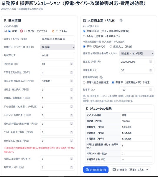 この損失には、生産・出荷停止による機会損失、人件費・固定費の空転、再立ち上げ・段取り直しのロスといった、製造業・物流業特有の影響が含まれています。