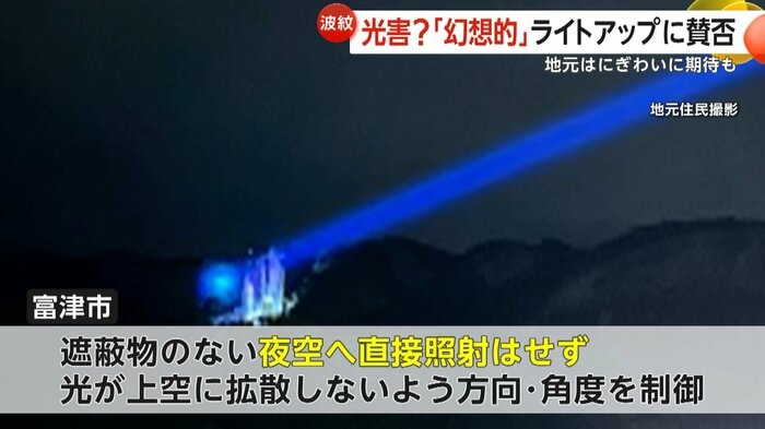 観光の目玉となるライトアップに歓迎の声が上がる中、ネット上では「せっかくの夜空が台無し」といった批判の声が上がった。