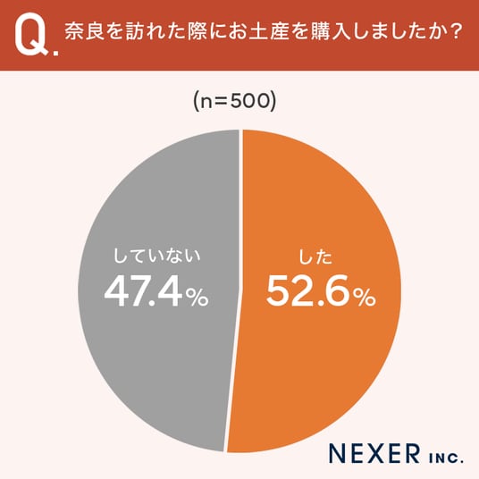 その結果「購入した」と回答した人は52.6%、「購入していない」は47.4%となりました。約半数の人がお土産を購入しており、奈良旅行の思い出として何かを持ち帰りたいと考える人が多いことがうかがえます。