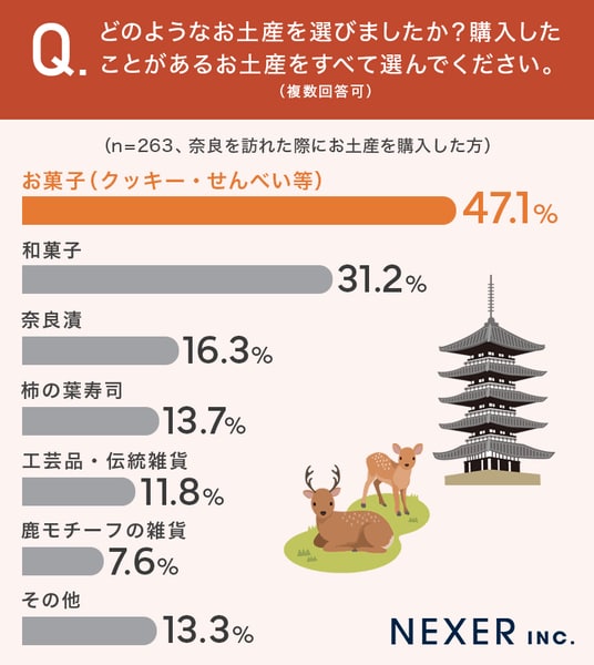 今回の調査により、奈良のイメージとして「東大寺・大仏」と「鹿」が圧倒的な認知度を誇ることが明らかになりました。奈良を訪れた人の約半数がお土産を購入しており、なかでも「お菓子」が多く選ばれています。