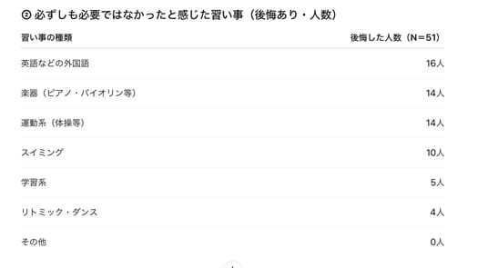 「振り返ってみて、必ずしも幼児期にさせる必要ではなかったと感じる習い事はありますか」という質問に対し、