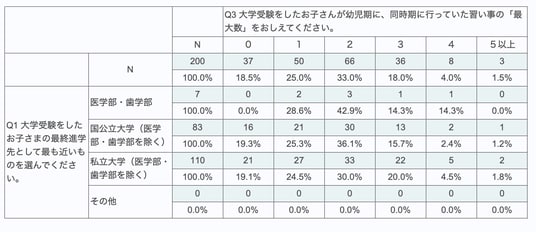大学受験をしたお子さんが幼児期に、同時期に行っていた習い事の「最大数」