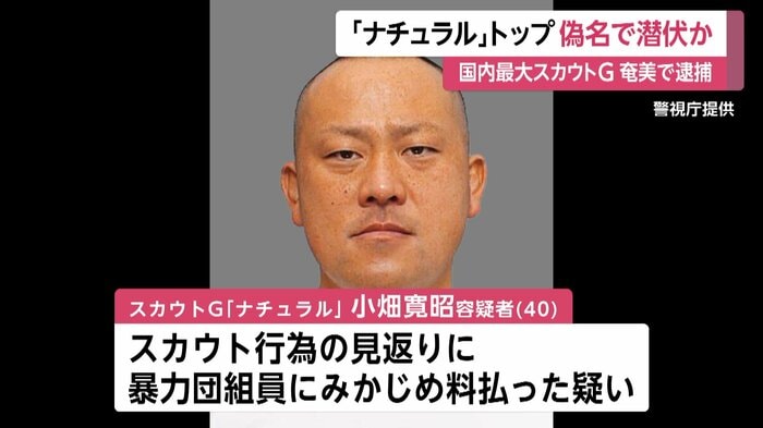「ナチュラル」の会長、小畑寛昭容疑者(40)は、スカウト行為の見返りとして暴力団組員にみかじめ料を払った疑いが持たれていて、26日に逃亡先の奄美大島で逮捕されました。