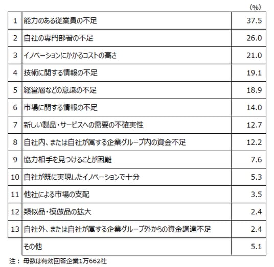 イノベーションの阻害要因、「能力のある従業員の不足」が37.5%でトップ