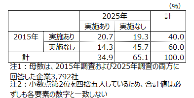 2015年調査および2025年調査の両方に回答した企業3,792社の実施状況を調べたところ、いずれの時期もイノベーション活動について「実施あり」とした企業は20.7%となり、5社に1社にとどまった。2015年調査「実施あり」かつ2025年調査「実施なし」の企業は19.3%、2015年「実施なし」かつ2025年「実施あり」は14.3%で、いずれも1割台だった。一方で、両方ともに「実施なし」は45.7%にのぼり、半数近くの企業が10年前と現在においてイノベーション活動を行っていなかった。
