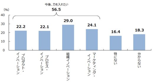 今後、イノベーション活動に力を入れたいと考えている企業は56.5%だった。タイプ別では、いずれも2割台となっていたが、なかでも「組織イノベーション」が29.0%で最も高かった(複数回答、以下同)。業務遂行の方法や手順などの業務慣行、権限の移譲、仕事の割り振り・編成などの職場組織、社外との関係構築といったイノベーションを通じて新しい変革を進めていこうとする認識が高くなる傾向がうかがえる。