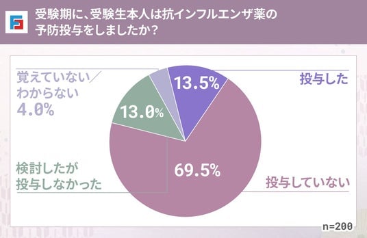 受験期に受験生本人が予防投与を行ったか尋ねたところ、最多は「投与していない(69.5%)」、次いで「投与した(13.5%)」「検討したが投与しなかった(13.0%)」「覚えていない/わからない(4.0%)」と続きました。