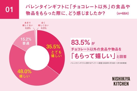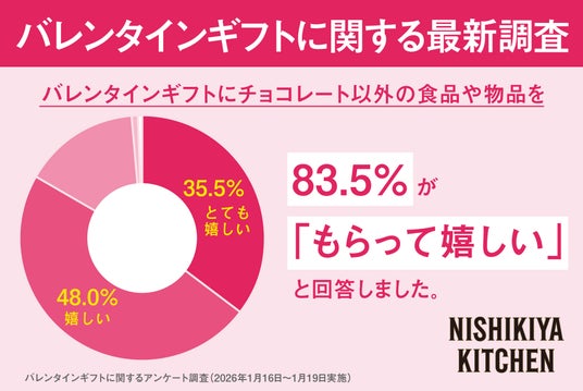 「世界の料理を『カンタン』に。」をコンセプトに掲げ、レトルトカレーを中心に約120種類のレトルト食品を販売する専門店NISHIKIYA KITCHEN(ニシキヤキッチン)(株式会社にしき食品 本社:宮城県岩沼市、代表取締役社長:菊池洋一)は、インターネットリサーチで20~50代の男女664人を対象に「バレンタインギフト」に関する調査を実施しました。その結果「チョコレート以外の食品や物品ももらって嬉しい」という考えを持つ人が全体の83.5%*にのぼり、バレンタインギフトは「脱チョコレート」時代へ突入したことが判明しました。チョコレート一択のイメージがあるバレンタインですが、近年の健康志向の高まりや選択肢のマンネリ化により価値観が変化し、ギフトの選択肢が広がり、より自由なものへと変化していると考えます。