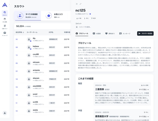 1.他では出会えない質の高い母集団新卒:登録者数1万人超。75%以上が東京一工早慶・海外大などの高学歴層。成長意欲の高い学生が多数。