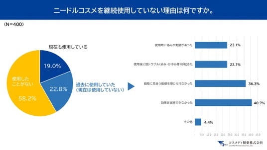 「使用したことがない」と回答した人が約6割(58.2%)。ニードルコスメへの興味関心は高い反面、何らかのハードルで使用や購入をためらっていることがわかりました。さらに「過去には使用していたが、現在は使用していない」と回答した人も約2割(22.8%)となり、現在ニードルコスメをスキンケアとして使用している人は2割以下(19.0%)に留まりました。
