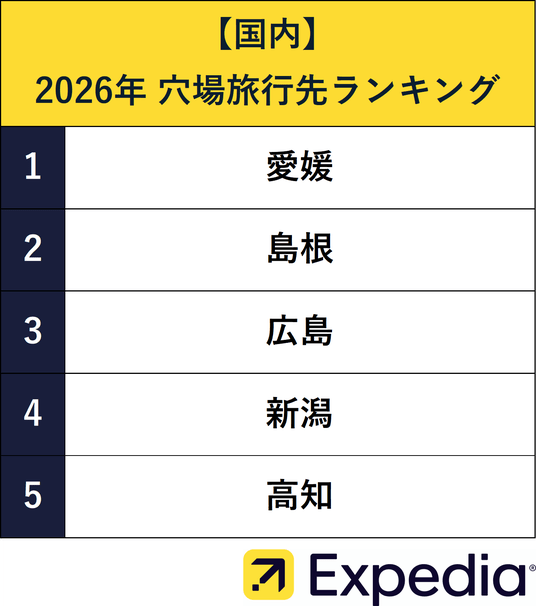 A5. 国内の穴場旅行先1位は「愛媛」です。瀬戸内海の景観や道後温泉、しまなみ海道など、多彩な体験ができます。2位は「島根」、3位は「広島」、4位は「新潟」、そして5位は「高知」です。