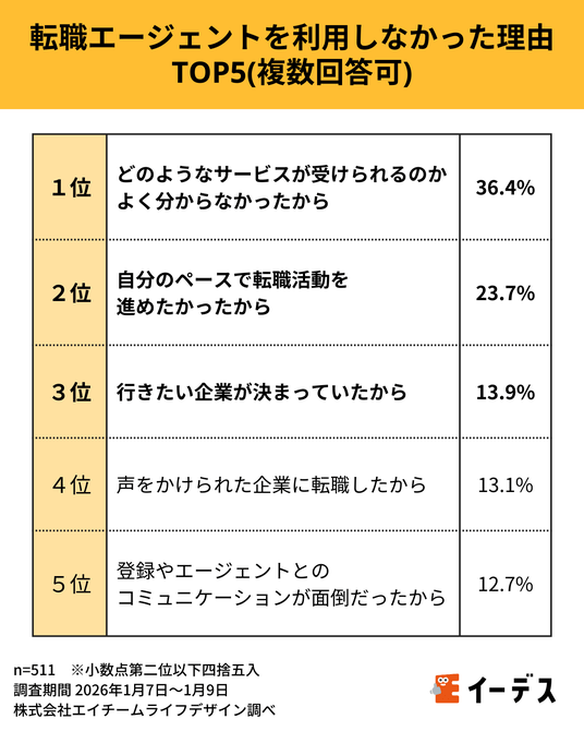 転職エージェントを利用しなかった理由として「どのようなサービスが受けられるのかよく分からなかったから」36.4%と、「自分のペースで転職活動を進めたかったから」23.7%の2つに回答が多く集まりました。