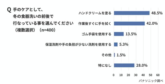 冬の食器洗い前後で行っている手のケアを聞くと、「作業後すぐに手を拭く」が42.0%、「ハンドクリームを塗る」が48.5%となったが、「お湯や洗剤に触れる時間を減らす工夫をしているか」という設問には7割以上が「していない」と回答。