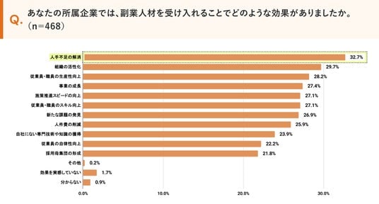 実際に副業人材に依頼している業務は「人事(19.7%)」、「DX(19.7%)」、「経営企画・総務・経理(19.4%)」、「商品企画・開発/Webデザイン(19.2%)」などが多く、副業人材を受け入れた結果、「人手不足の解消(32.7%)」「組織の活性化(29.7%)」、「生産性向上(28.2%)」に効果があったという回答が上位でした。副業人材活用が、企業の経営課題の解決にとって有効な手段であることが分かります。