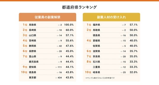 地域別に見ると、副業解禁率は「中部地方(40.5%)」で最も高く、都道府県別では、1位「鳥取県(100.0%)」※、2位「長崎県(60.0%)」、3位「山口県(57.1%)」となりました。副業人材の受け入れは、前回調査に続き「四国地方(32.7%)」が最も高い結果となりました。都道府県別では、1位が「福井県(57.1%)」、2位が「鳥取県(50.0%)」※「徳島県(50.0%)」となり、地方エリアでも「解禁」にとどまらず、活用フェーズに入っている企業が増えていることが分かります。
