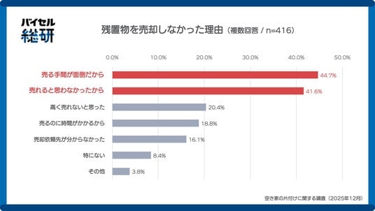 売却を選択しなかった人に理由を尋ねたところ、「売る手間や立ち合いが面倒だから(44.7%)」が最も多く、「売れないと思った(41.6%)」「高く売れないと思った(20.4%)」と続きました。