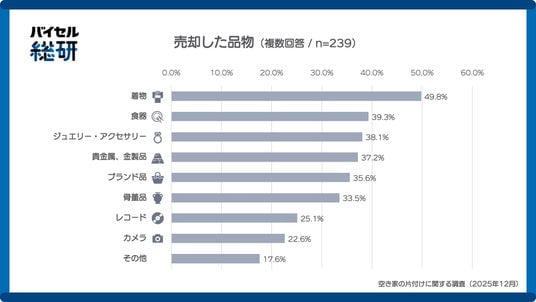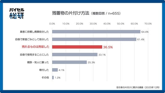 株式会社BuySell Technologies(本社:東京都新宿、代表取締役社長兼CEO:徳重 浩介)が運営する調査研究プロジェクト「バイセル総研」は、空き家を相続し、空き家に残された品物(以下、残置物)の片付けが完了した655名を対象に、残置物の処分方法について調査を行いました。