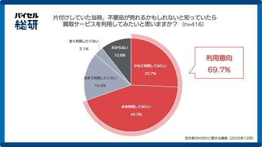 売却を行わなかった人に対し、「もし、空き家の片付けをしていた当時に不用品が売れるかもしれないと知っていたら、買取サービスを利用してみたいですか?」と質問したところ、「かなり利用してみたい(25.7%)」「まあ利用してみたい(44.0%)」を合わせた計69.7%が、サービスの利用意向があると回答しました。