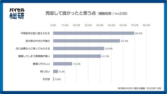 売却を行った人に、売却してよかったと思う点を尋ねたところ、「不用品をお金に変えられる(69.5%)」「空き家の片付けが進む(57.3%)」と、経済面や効率面が上位となりました。次いで、「次に必要な人に使ってもらえる(43.9%)」「廃棄してしまう罪悪感が無い(41.0%)」も選択されており、心理的な側面でのメリットがあることが伺えました。