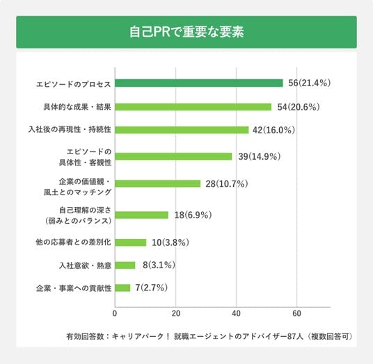 新卒採用支援事業を展開するキャリアパーク! 就職エージェント(ポート株式会社、代表取締役社長CEO 春日博文、所在地:東京都新宿区、以下「当社」)は、日々採用の現場に立ち会っている当社所属のキャリアアドバイザー87名を対象とした「就職活動の自己PRに関する実態調査」を実施しました。