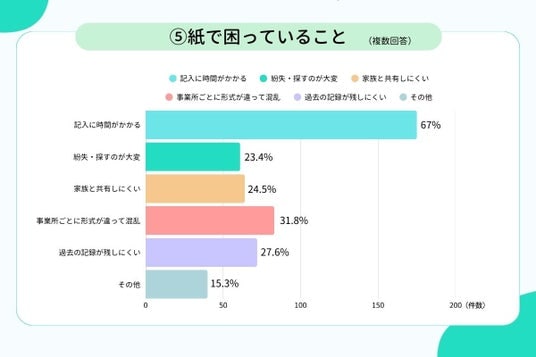 具体的な課題としては、「記入に時間がかかる」が67.0%が最も多く、事業所ごとに形式がことなることによる混乱や、過去の記録が残りにくい、家族と情報を共有しにくいといった点があげられています。