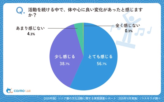 体や心の変化については、「とても感じる」(56.7%)と「少し感じる」(38.7%)を合わせると、約95%が何らかの良い変化を実感しています。