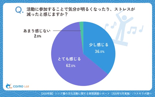 「あまりない」(8.0%)や、「全くない」(1.0%)は少数にとどまり、文化活動が認知面の活性化や気分の切り替えに寄与している姿が浮き彫りになりました。