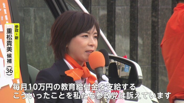 参政党の新人、重松貴美さん(36)。鳥栖市の会社役員で前回の衆院選は熊本1区から立候補。今回初めて地元佐賀での国政選挙に臨む。