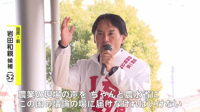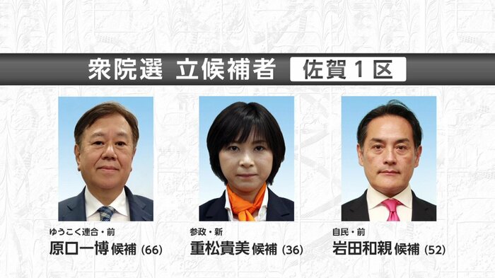 佐賀1区に立候補したのは、届け出順に、ゆうこく連合・前職の原口一博さん(66)。参政党・新人の重松貴美さん(36)。自民党・前職の岩田和親さん(52)の3人。