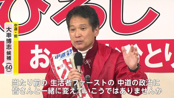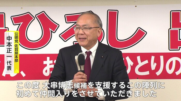 中道改革連合・前職の大串博志さん(60)。出陣式には、新党として協力態勢を組む公明党の県議や市議が初めて応援に駆け付けた。