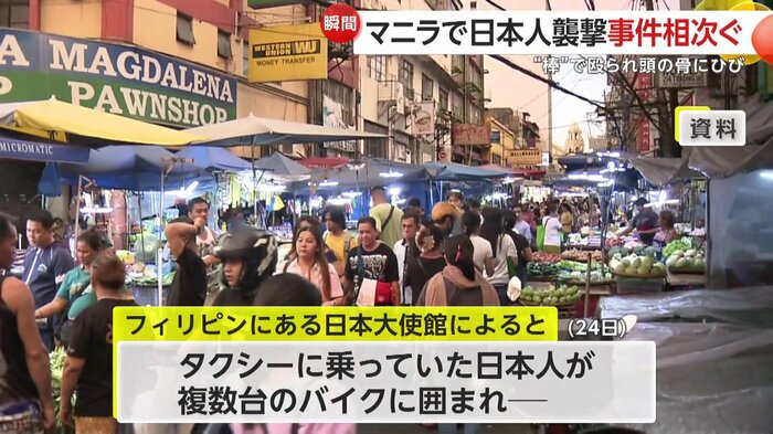 マニラでは同じ日、別の場所でもタクシーに乗っていた日本人が複数台のバイクに囲まれ、拳銃のようなものを突き付けられる事件が起きた。