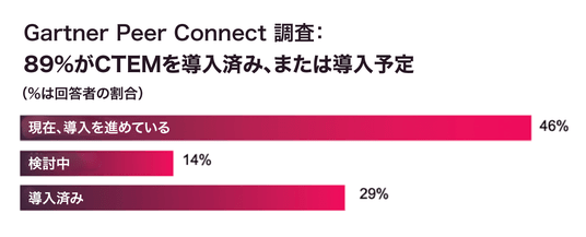 多くの組織は、エクスポージャー管理に喫緊の必要性を感じています。米国の調査会社ガートナーの調査によると、89%の組織がCTEM(Continuous Threat Exposure Management、継続的脅威エクスポージャー管理)プログラムをすでに導入済み、または導入を検討しています。これは、従来のエクスポージャー管理の手法がもはや実際の規模にそぐわないという認識が、組織の間で広がっていることを示しています。