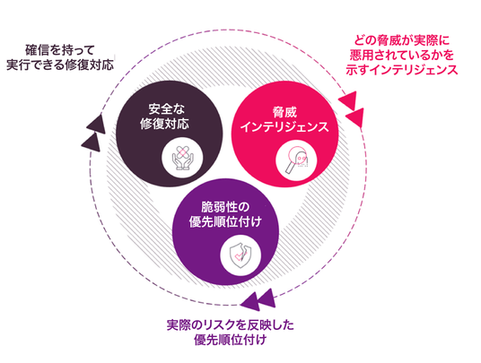 効果的なエクスポージャー管理は、「脅威インテリジェンス→脆弱性の優先順位付け→安全な修復対応」という、循環的なプロセスに従っています。