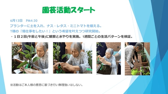 近年、施設の中で昼夜逆転や中途覚醒が増え、認知症の症状も目立つようになってきた。また、本人への聴き取りで「畑仕事をしたい」という希望があったことから、園芸活動が心理面・生活リズムに効果を与える可能性があると考え、研究テーマとして設定した。