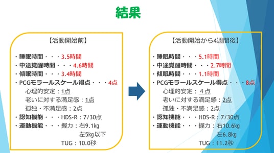 見守りセンサーのデータから、日中の傾眠や夜間の中途覚醒が減少するなど、生活リズムの安定が確認された。