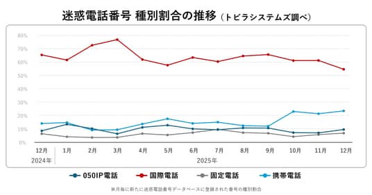 ○携帯電話番号を使った不審電話が引き続き発生2025年12月に新たにトビラシステムズの迷惑電話番号データベースに登録された番号の種別割合は、国際電話番号が54.6%(前月比−6.6%)で、前月よりわずかに減少しました。