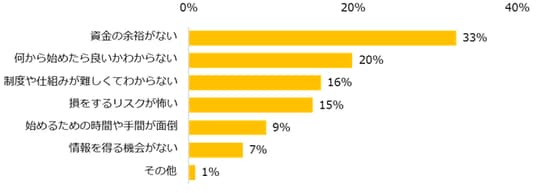 現在、資産形成を行なっていないと回答した方にその理由を伺うと、上位は「資金の余裕がない」(33%)、「何から始めたら良いかわからない」(20%)、「制度や仕組みが難しくてわからない」(16%)でした。