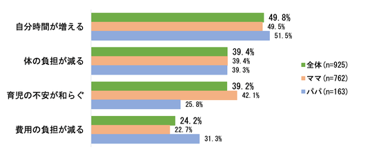 次に、社会全体で子育てを支える「トモイク」にどのような「メリットを感じる/期待する」か聞いたところ、トップ回答が「自分時間が増える」49.8%、2位「体の負担が減る」39.4%でした。ママは「育児の不安が和らぐ」が42.1%とパパの同回答25.8%より16.3ポイントも高い数字に。パパは「費用の負担が減る」が31.3%と、経済メリットも感じているようです。