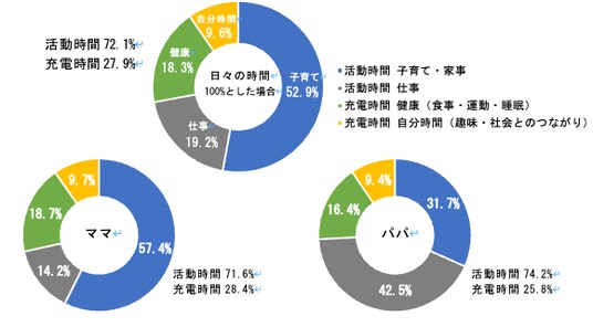 日々の時間を100%とした場合の「自分時間(趣味・社会とのつながり)」の割合(%)は「9.6%」しかなく、生活維持のための“活動時間”(「子育て・家事」52.9%「仕事」19.2%)は合計72.1%、「自分時間」を含めた「健康(食事・運動・睡眠)」に配慮した“充電時間”は合計27.9%。さらに「健康」に関しては32.4%が「子ども優先でおろそかになった」と子どもを最優先に考える実態がある一方で、ママ・パパ自身の健康が後回しにせざるを得ない実情が伺えた。