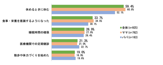 「トモイク」の浸透による「体の負担軽減=健康」についてはどうでしょうか。今回、子育てを通じて約8割(79.6%)が「ウェルビーイング(心と生活の幸福感)が高まった」と回答しました。しかしながら現状、「健康(食事・運動・睡眠)」に関しては32.4%が「子ども優先でおろそかになった」と感じ、特にママはパパよりも7.3ポイント高い3人に1人(33.7%)がご自身の健康よりも“子育てファースト”になりがちな傾向が伺えました。その中でもママ60.8%・パパ52.1%ともに「休めるときに休む」を意識して乗り切っているようです。